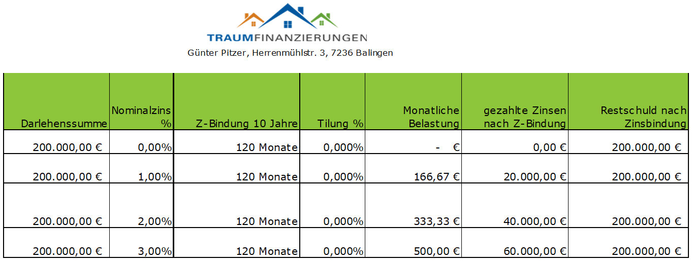 Wenn Sie nur 1% mehr Zins auf einen Darlehensbetrag von 200.000 € bezahlen müssen, sind das 2.000 € Mehrbelastung pro Jahr.