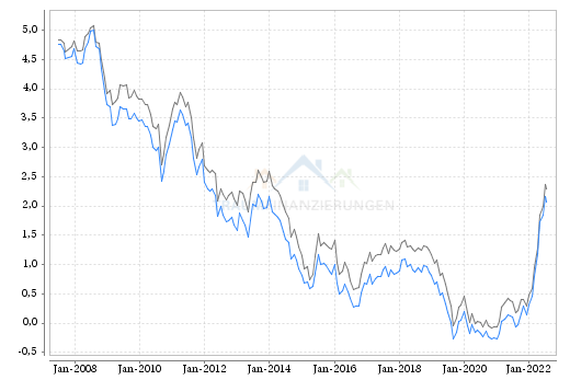 Blau sehen Sie die Entwicklung für 10 jährige Zinsbindungen, Grau für 15 jährige Zinsbindungen.